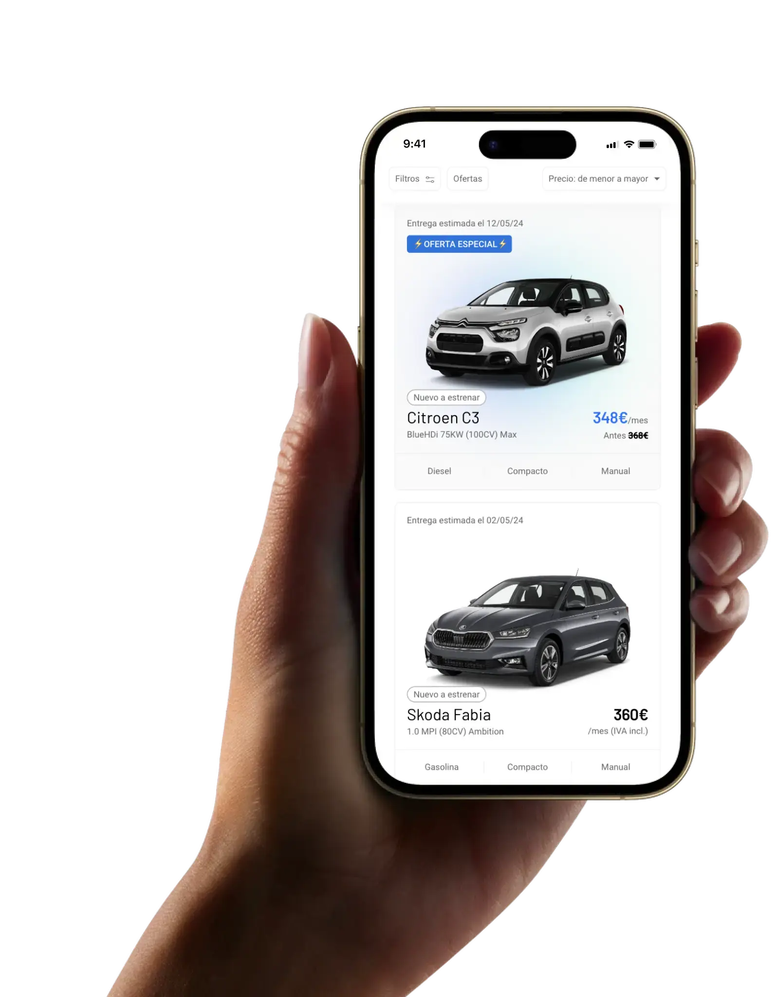 Disfruta de tu coche pagando una única cuota mensual con todo incluido: seguro, mantenimiento, asistencia en carretera e impuestos. Además, contarás con atención personalizada y una app desde la que podrás gestionar fácilmente todo lo relacionado con tu renting.